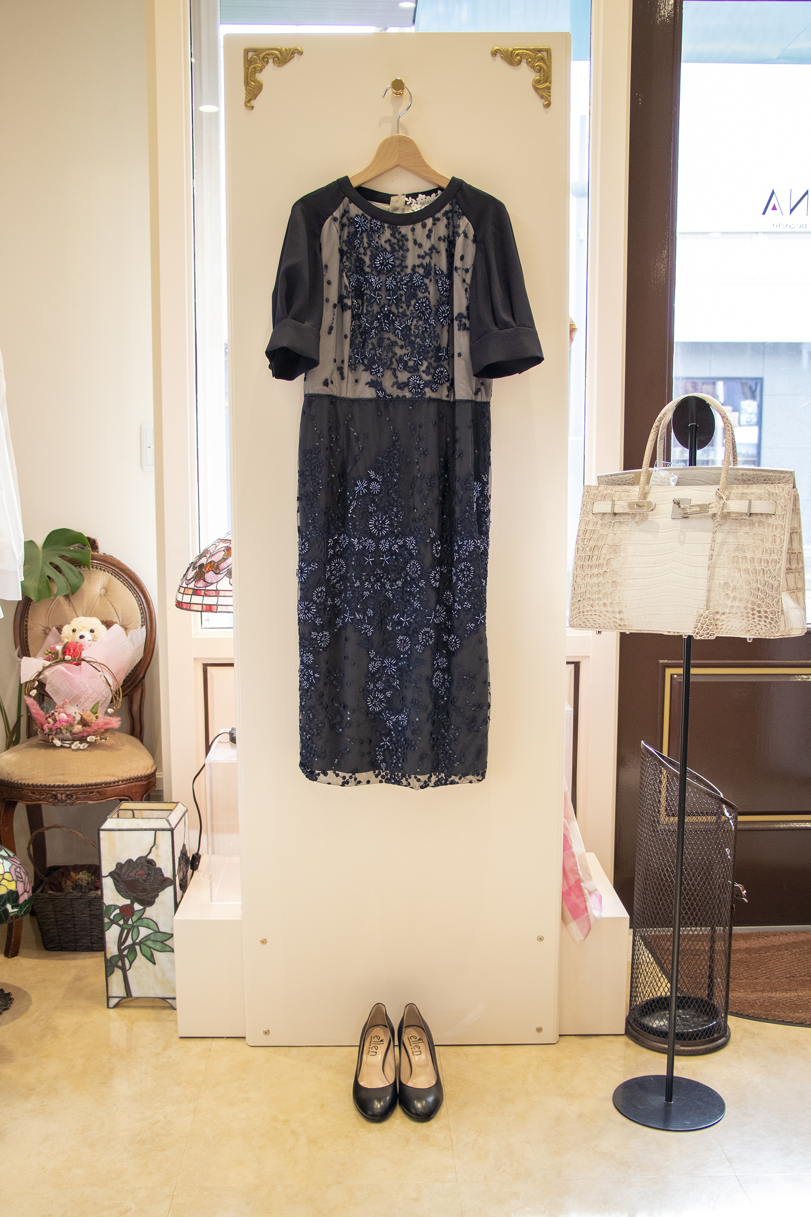 ボタニカル柄をケミカルレースで表現した、繊細に見えるようにステッチワークを駆使して美しいレースに仕上げたブラックワンピースです。